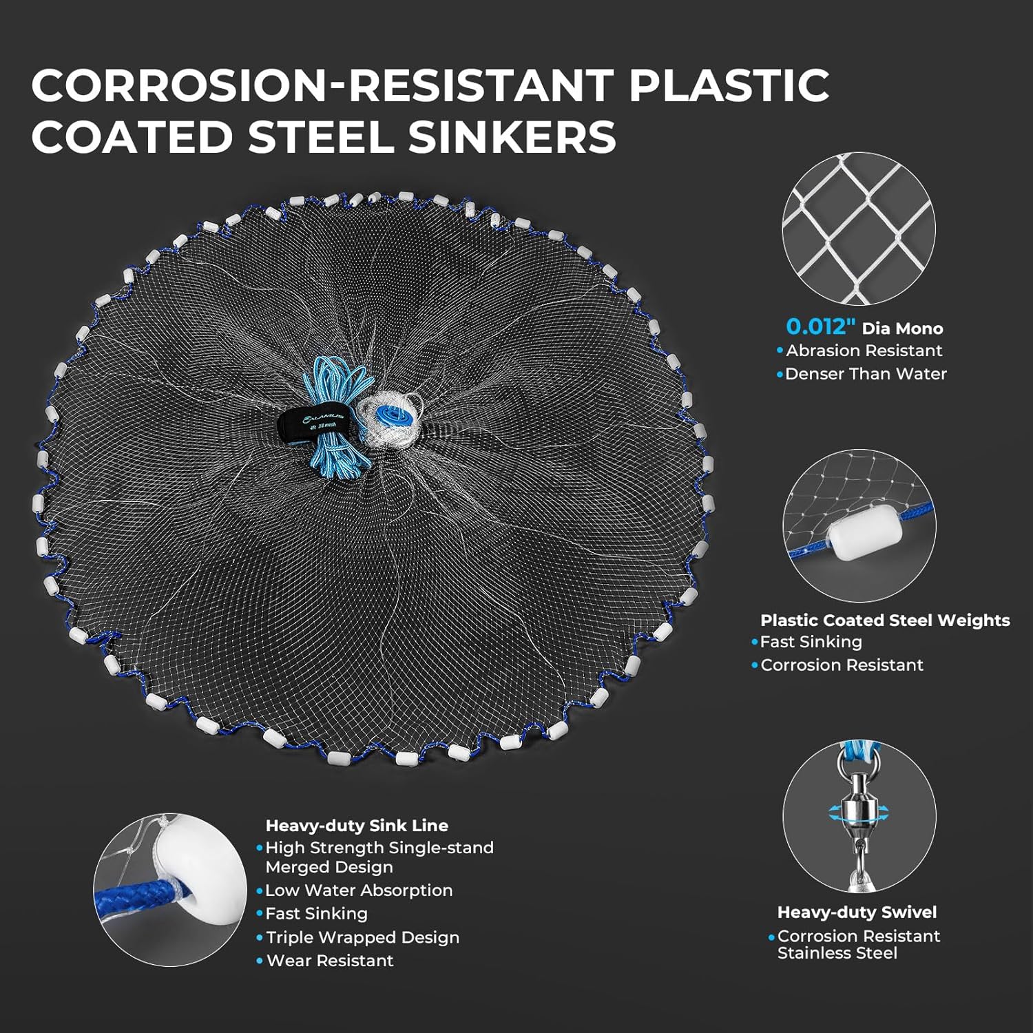 Calamus Cast Net 3/8″ Mesh for Freshwater and Saltwater, 3ft-6ft Radius Casting Nets with Heavy-Duty Sinking Nylon Line, Mesh Storage Bag & Storage Bucket & Net Repair Kit